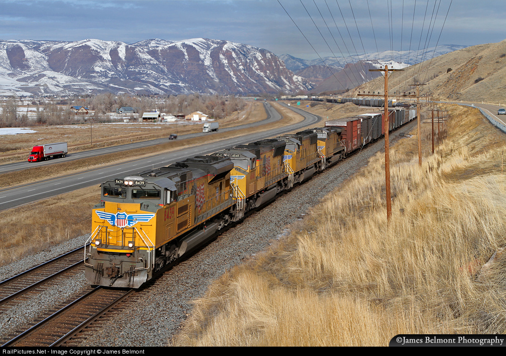 | Union Pacific's West Colton, CA to North Platte, NE manifest climbs eastward through the Weber River Valley at Henefer, Utah. |