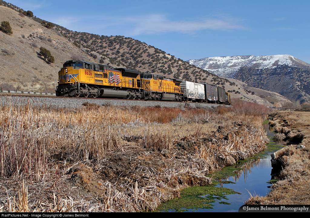 | Union Pacific's North Platte, NE to West Colton, CA manifest glides westward into a picturesque seven degree curve at the east end of Morgan, Utah. |
