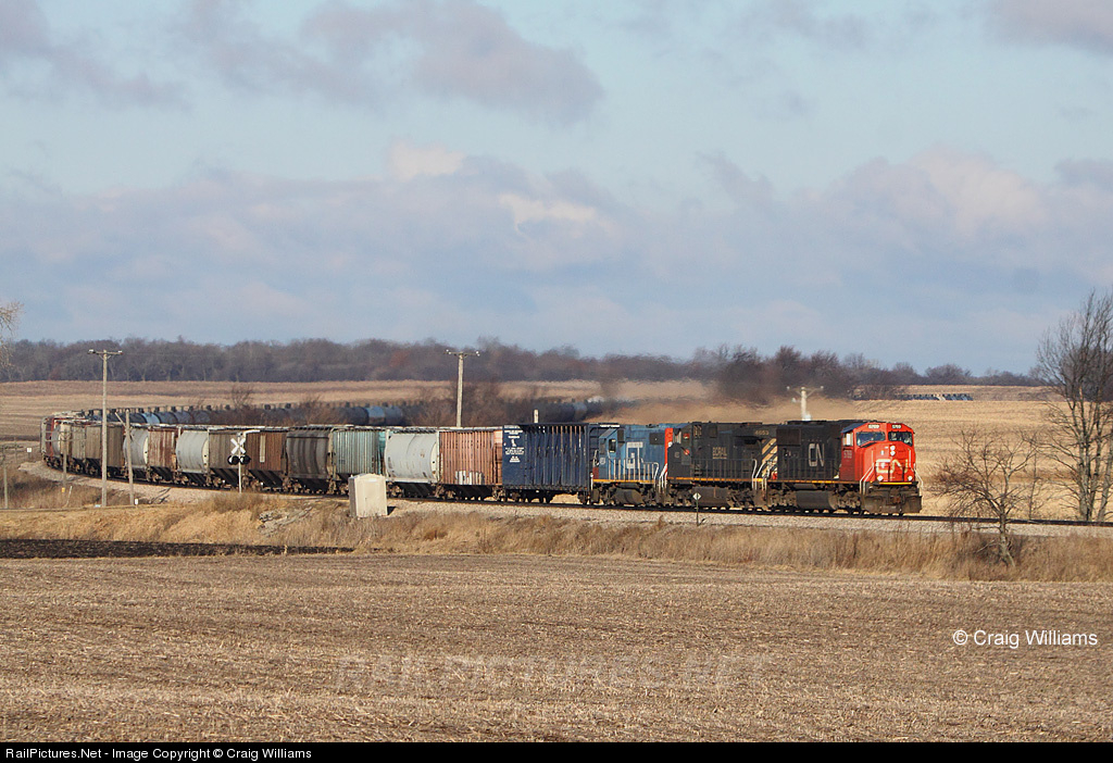 This Tara, IA, to Chicago, IL, CSXT, ethanol train hammers down to make 50 mph in the country as they past MP 59. The train is 49 miles from Hawthorne Yard where the train will be delivered off to the CSXT. This train has 26 cars of freight added out of Waterloo, a standard CN philosophy.