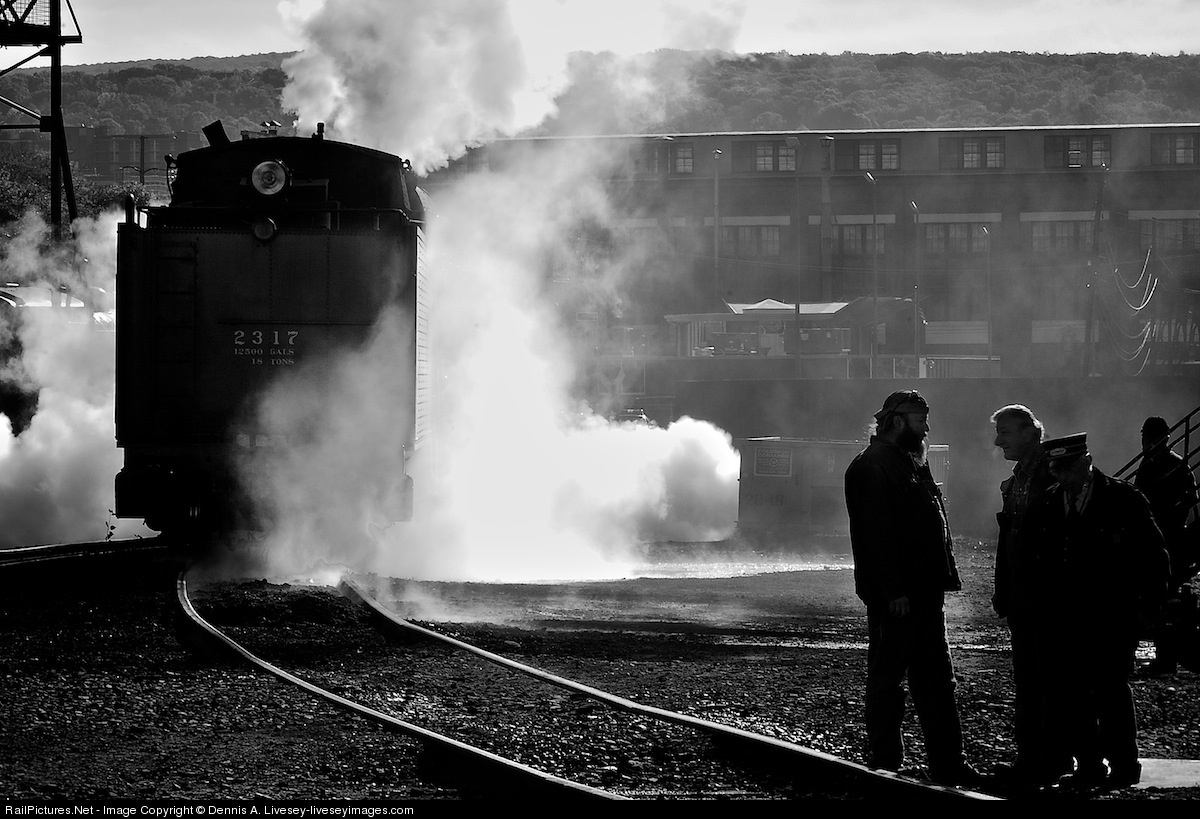 No. 2317 steams up the Gangway track after dumping ash. On the right, her mechanic, carman and conductor confer before the day's work on "The Shuttle."