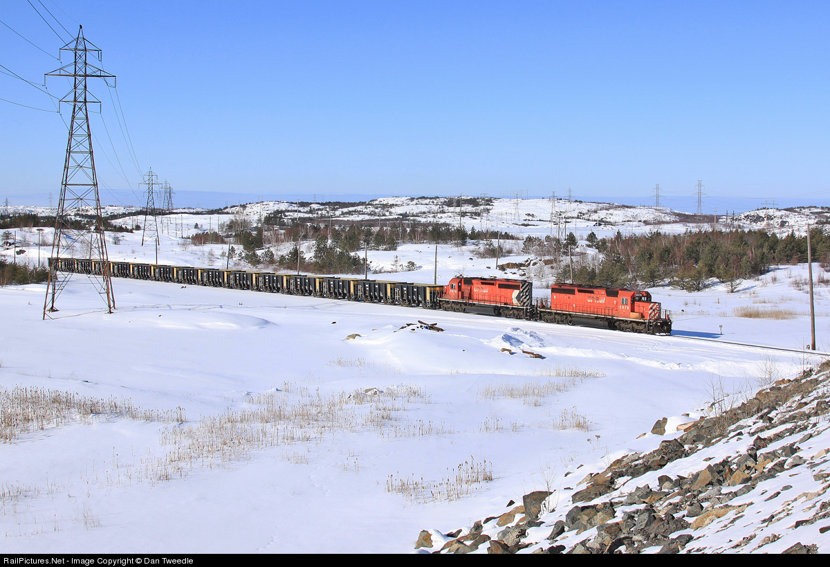 | CP 5978 and 5876 bring 15 empties out of the smelter at Vale for the run up to Levack for interchange at a mine. Unfortunately, 5876 would develop engine problems and would be replaced with 6228 for a night run to Levack. |