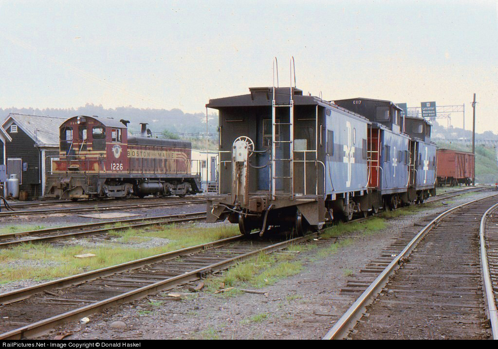Cabooses waiting for assignments at the small soon to be abandoned terminal. At the time of this picture the SW-8 was one of the few B&M units still in pre McGinnis livery.