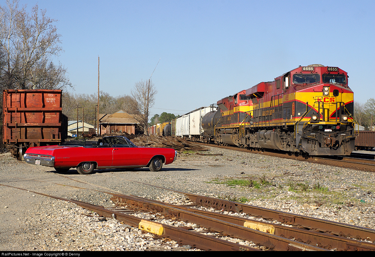 KCS freight moves past a 1969 Chrysler 300 convertible at track speed through Mansfield, Louisiana. MOW cars for hauling out discarded crossties are one side, aggregate gondolas on the other.