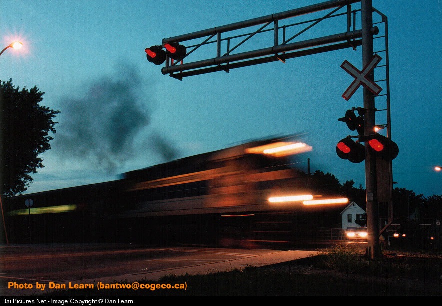 The Port Colborne Flyer crosses Main St. at night pulling a special train for the Canal Days Festival.