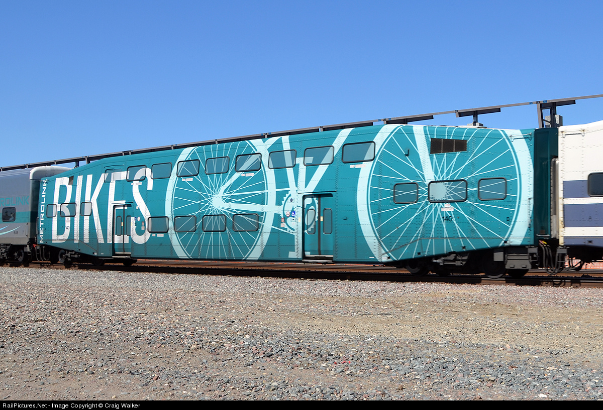 After the delivery of their new Korean-built passenger cars, Metrolink had enough of their older Bombardier coaches to convert many of them to bicycle cars by removing the seats on the lower level and installing bike racks in their place. Here, on train 662, is car 140, one of two bike cars to receive special wrap markings promoting this service (138 is the other), passing through Fullerton, California.