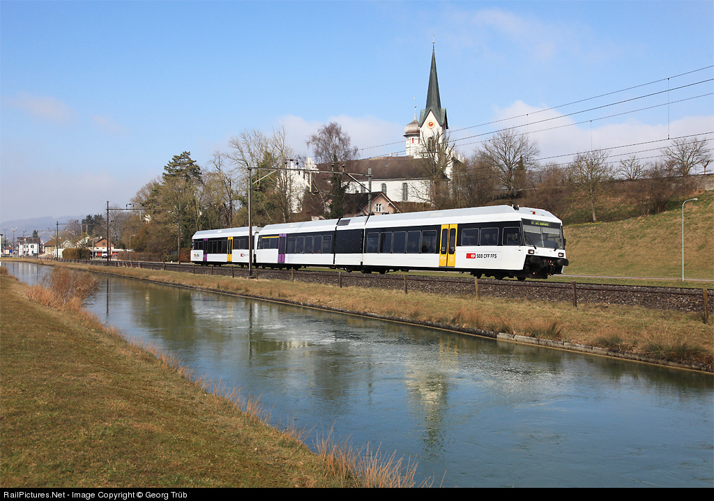 | Lowfloor articulated trainset "GTW" RABe 526 686 with cab car Bt series 221-224 with the S 5 service from Weinfelden via Sulgen-Gossau to St.Gallen. 10 of tis trainsets were built in 1998/1999 by Stadler for the "Seelinie" (line along Bodensee and Untersee) of the Mittel-Thurgau-Bahn (MThB). Now they are running for the SBB daughter THURBO. |
