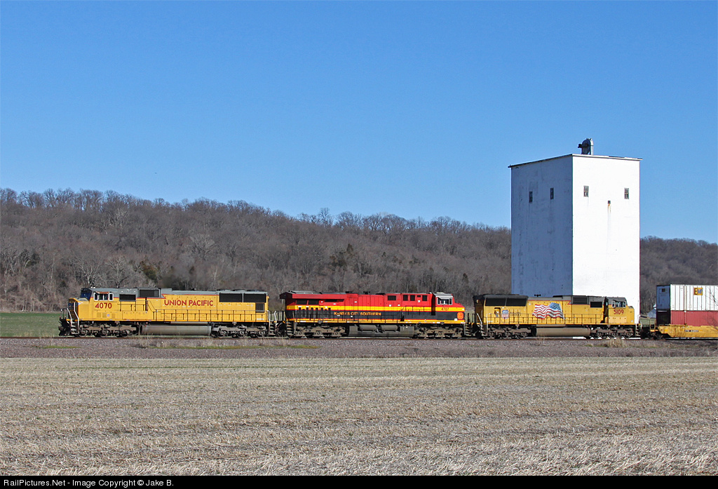 | Two UP SD70Ms sandwich a KCS Southern Belle on KMNOA as it powers back up to track speed. The colorful engines and containers contrast the drab, brown tones of the Southern Illinois farmland quite well. |