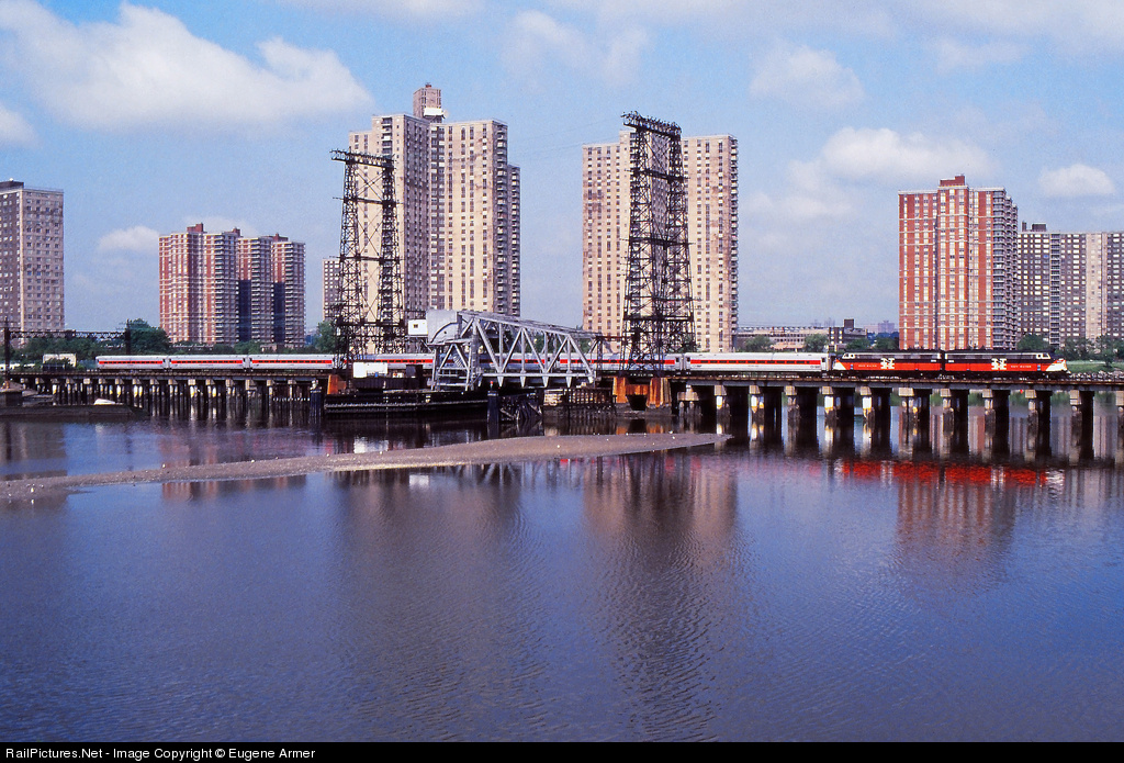 A New Haven RR Historical & Technical Association special from New Haven, CT to Greenport, Long Island is crossing the Pelham Bay drawbridge, with a pair of ConnDOT FL9's shoving on the rear. Of course, only New Haven liveried FL9's would do on this train!