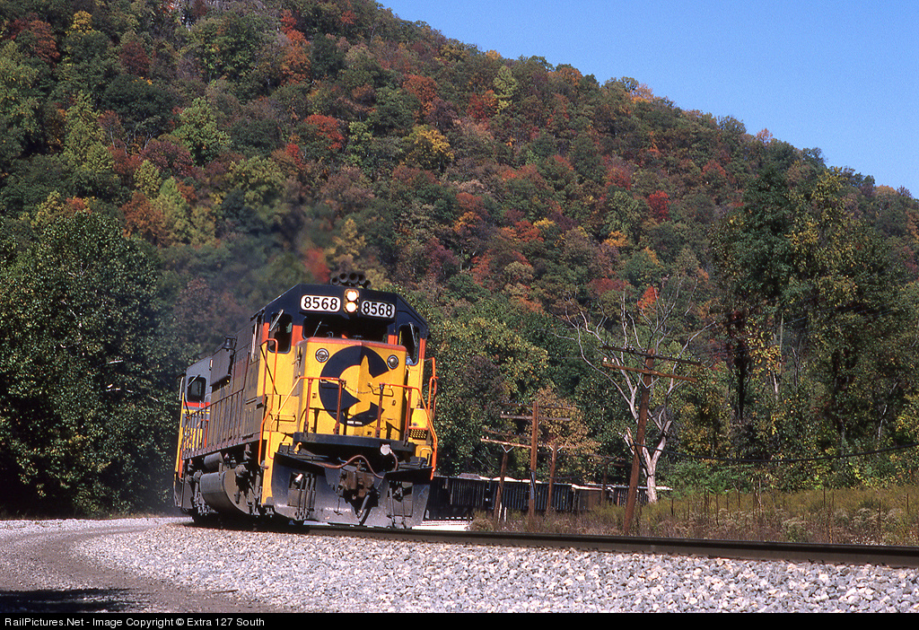 | A westbound CSX manifest was rounding the horseshoe curve between Grasshopper and Ambrose, WV on Oct. 15, 1987, led by C&O SD50 No. 8568. |
