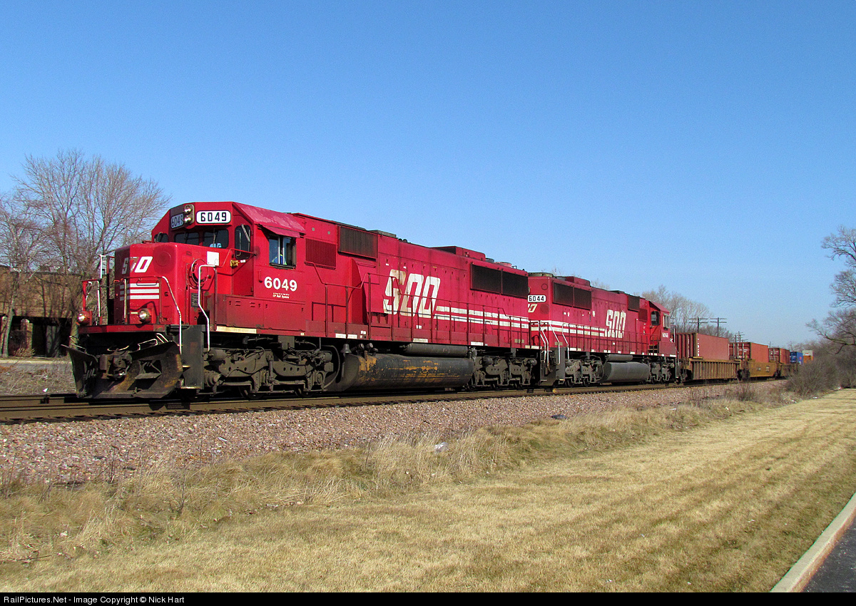 | Running on UP trackage, CP 182 rolls through Howard Street with a matching pair of candy apple red, Soo Line SD60's. |