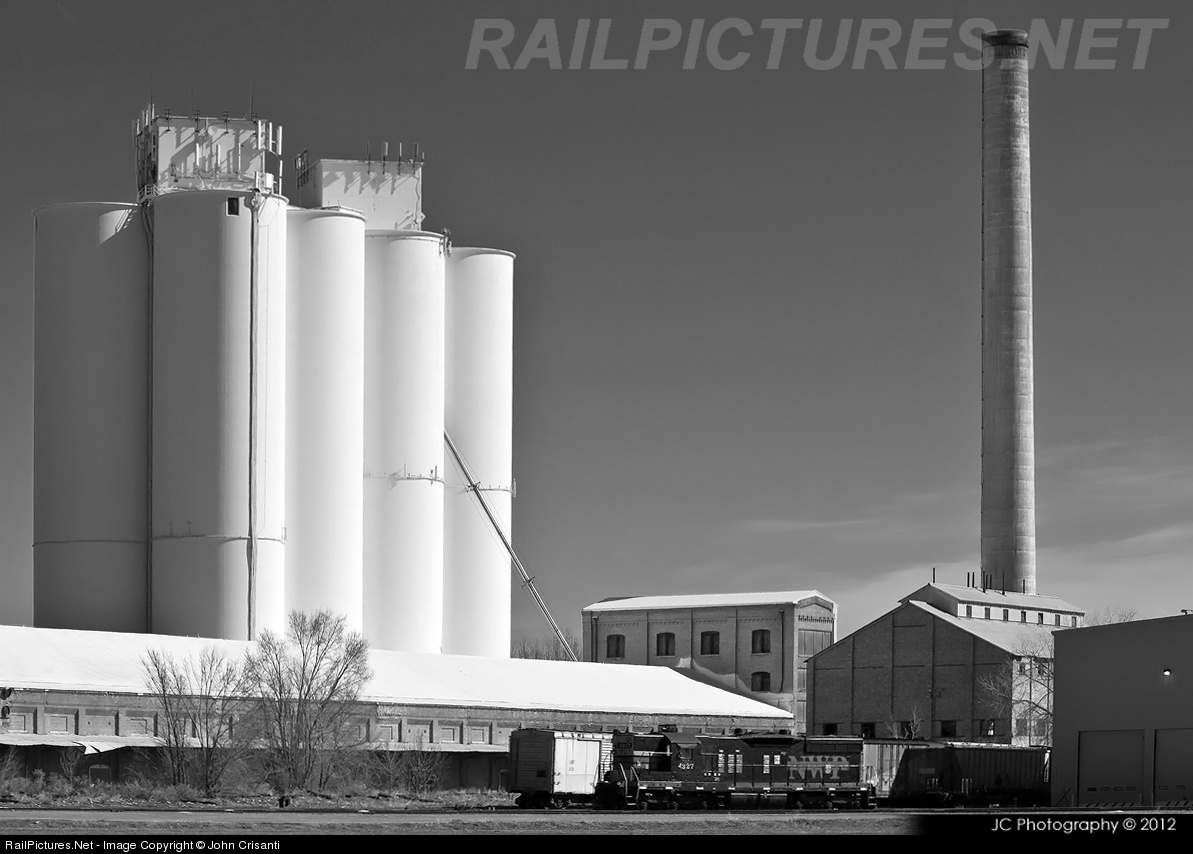 | Looking much like a model railroad, OMLX 4327 in Northwestern Pacific Black Widow scheme sits alone near the old Sugar Mill and Great Western Omnitrax shops in Loveland, CO. This unit will be used on the GW1 job later today to Johnstown. |