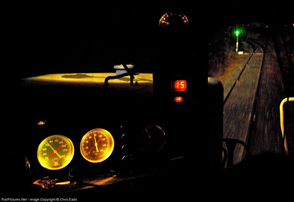 Keymar, MD 12/27/2011 -- Travelling at 15 m.p.h. (digital numbers), the engineer has applied a seventeen pound reduction to his air brakes (gauges) to slow his train for the siding ahead, beckoned by a clear signal that is highlighting drops of cold rain on this chilly December night. The train is the Maryland Midland's daily stone train that shuttles cars between quarry and distributor along former Pennsylvania Railroad and Western Maryland Railway trackage. The WM was at one time controlled by automatic block signals, which have been out of service for over 30 years. But at Keymar, the need for switch position indicators at the interchange between the former WM and PRR lines led MMID crews to restore two classic WM signals, which now simply indicate how the switches are lined--clear for "normal position" and yellow for "reverse position." Several other modern signals have also been placed at this interchange. Train crews throw the switches by radio well in advance of their arrival.