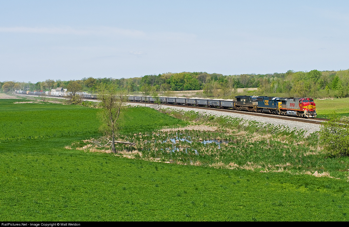 An assortment of class one power including BNSF 762, CSXT 8572 and NS 9976 approach an area on the old B&O Chicago Line known as the Blue Grass Cut.