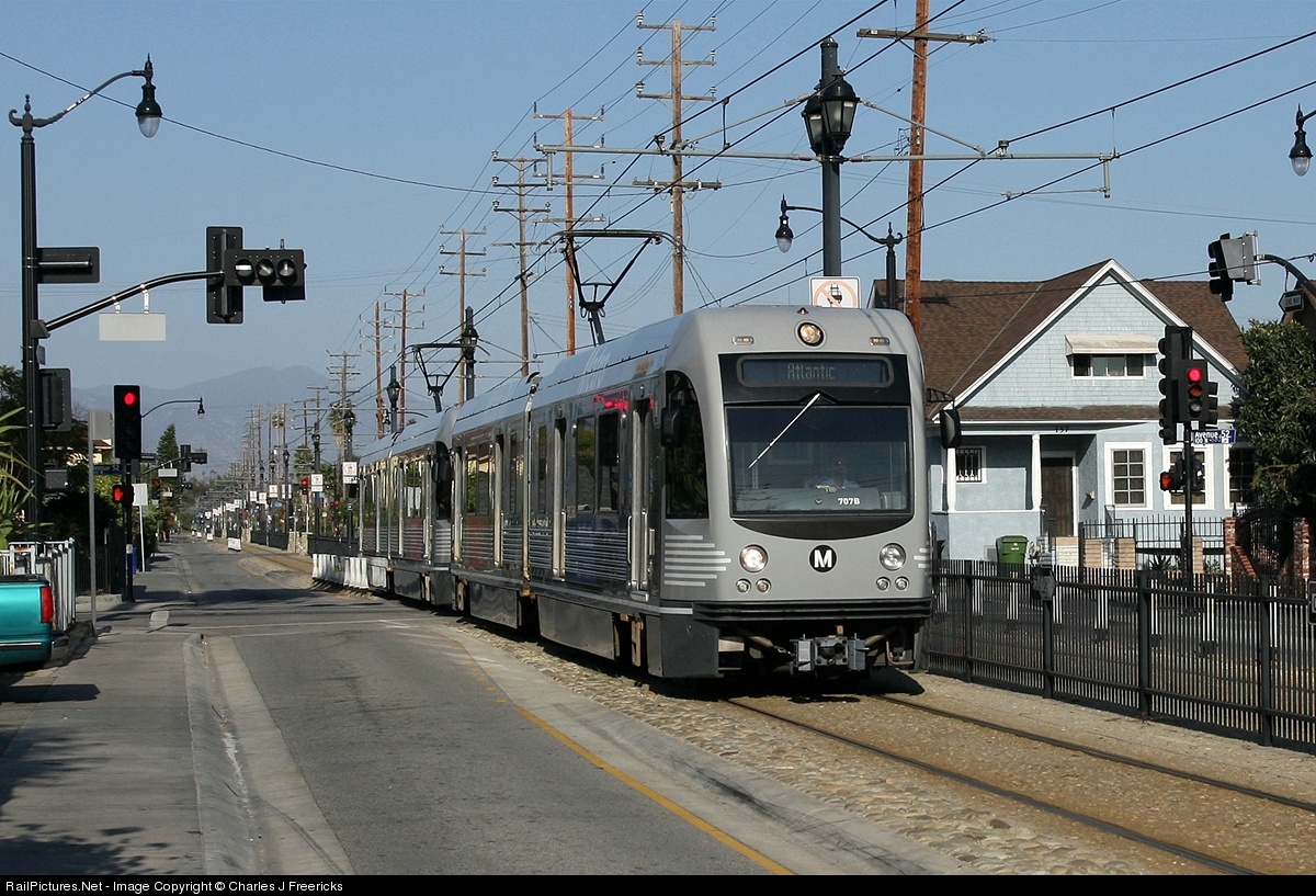 | Where the Super Chief used to roll down Marmion Way in Highland Park now only these little electric pocket streamliners dare to tread. A set of Bredas head for Atlantic Avenue in East LA, running on the ROW of the ATSF Second District, about half way between Pasadena and Los Angeles. |