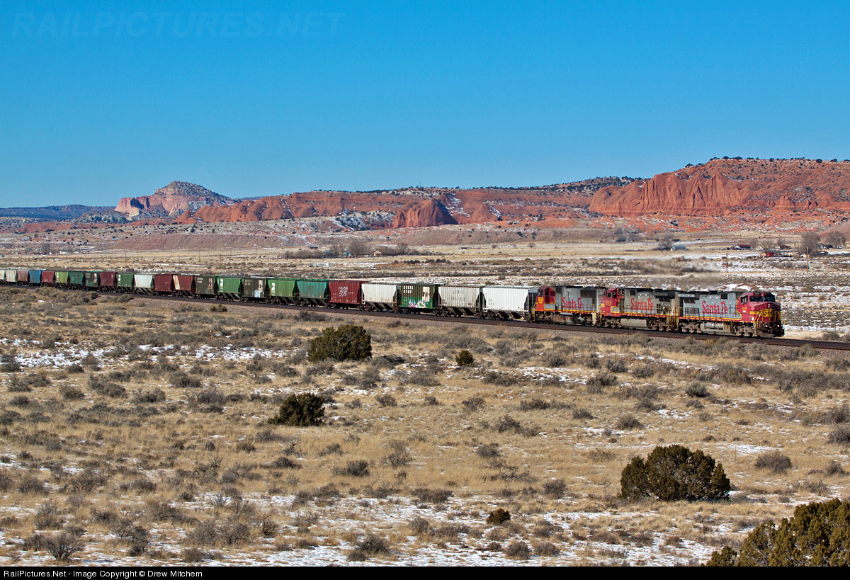 A late christmas present from BNSF. 3 ex-ATSF warbonnets lead a BNSF grain empty eastbound through scenery familiar to the Sante Fe, the beautiful red cliffs east of Gallup,NM. This shot was taken near Perea,NM on 12/26/11.