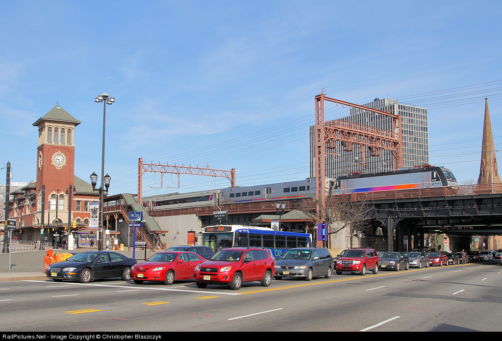 NJT 4635 accelerates out of the former Lackawanna Broad Street Station headed to the Big Apple while the traffic below on Broad Street anxiously awaits a green light.