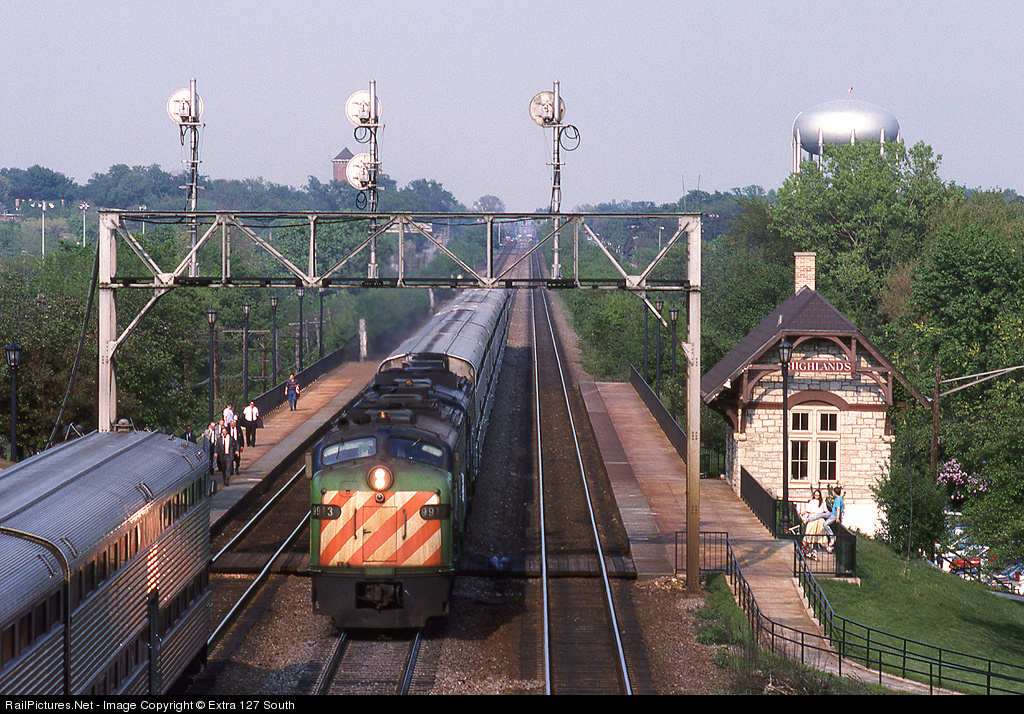 | A westbound Metra commuter train had just departed after unloading a crowd of passengers at the Highlands Station as a westbound express blasted by on the center track, led by E9U No. 9913. |