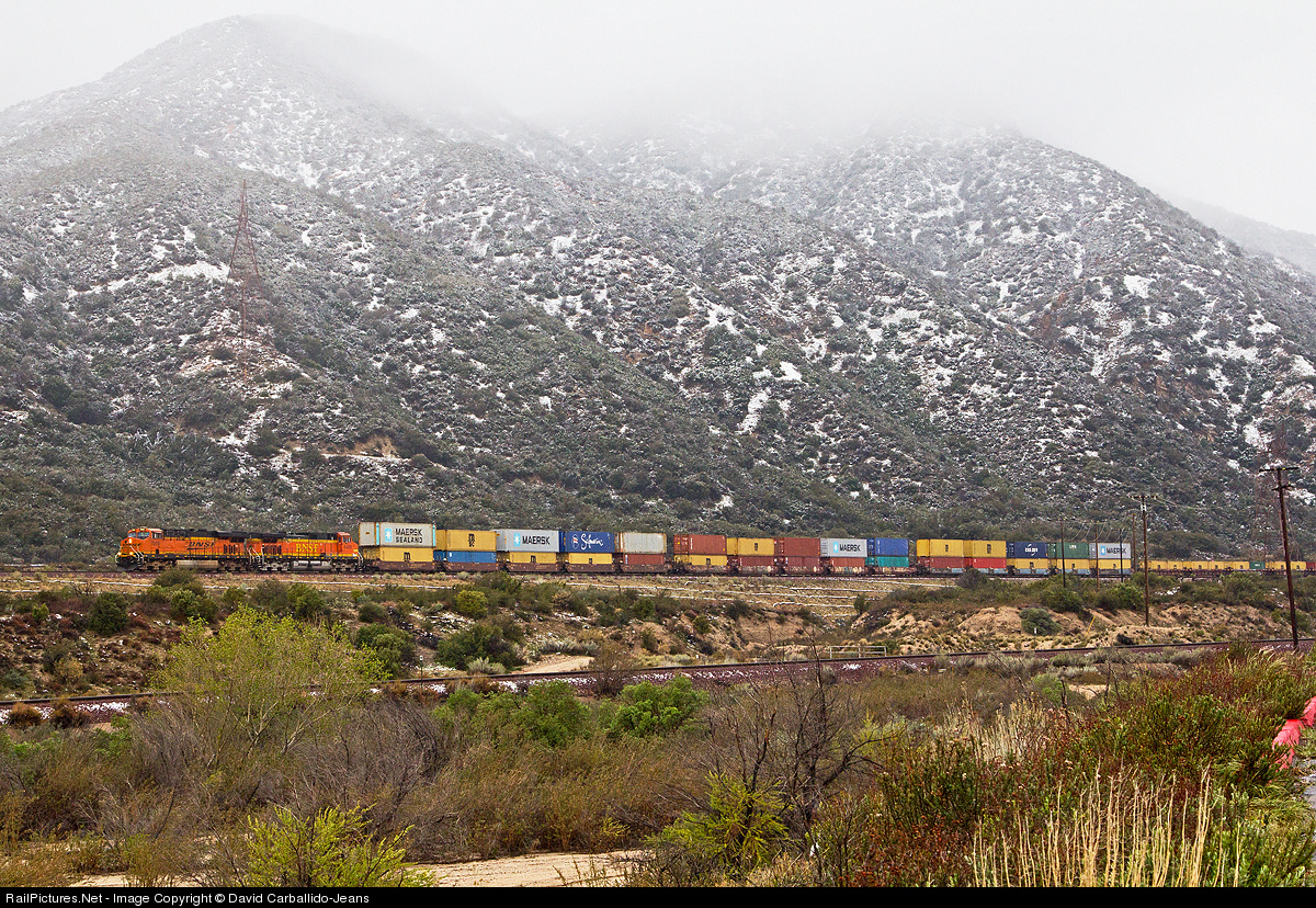 | BNSF 7310 and another ES44DC pull this Long Beach bound stack train down Cajon Pass. With the last winter storm of the season rolling through, a mixture of rain and snow falls while still some of the snow from last nights snowfall still lays on the side of the mountains. |
