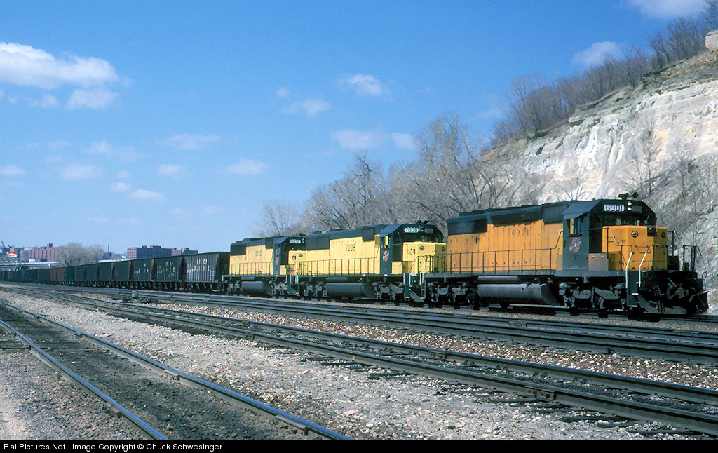 | CNW coal loads at St. Paul with 6901, 7006, 8032. The CNW had seeming gotten their act together by this date and it was reflected by the SD50/60 purchases and much more coal business along with being the UP's road of choice from Council Bluffs to the eastern connections at Chicago. |