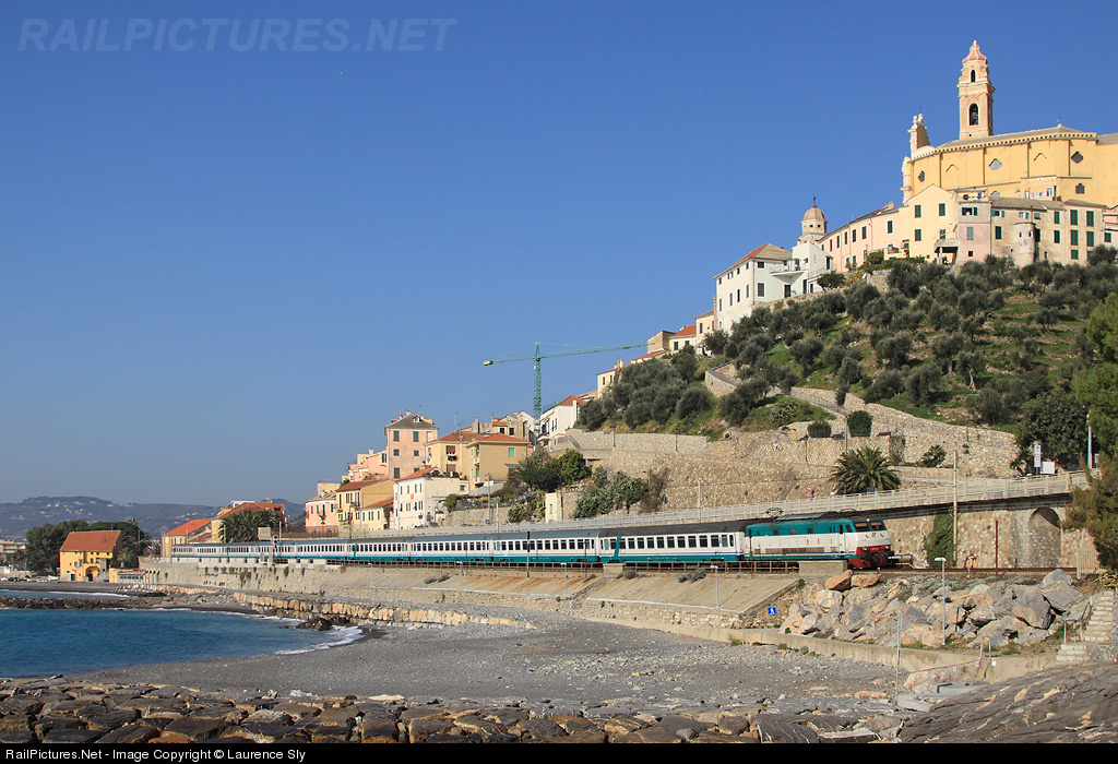 444-046 passes Cervo whilst working Inter City train 663, the 0858 Ventimiglia-Milano Centrale.
