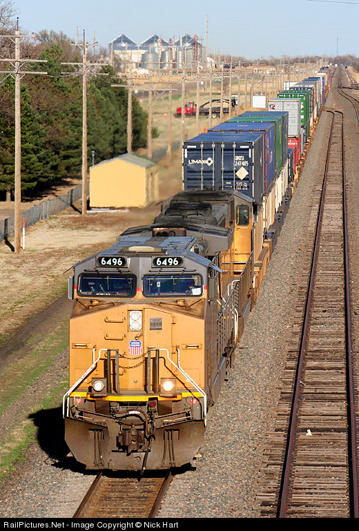 | UP 6496 rolls through Sutherland, headed west, as seen from the pedestrian bridge in town. |