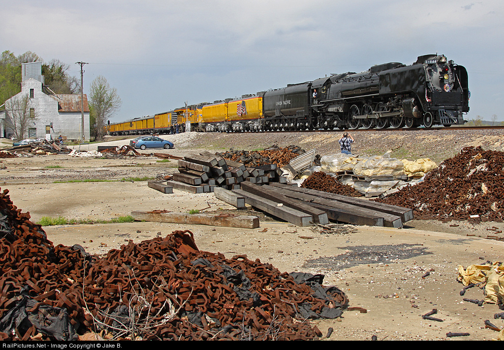 Union Pacific 844, adorned with flags from both the Confederacy and the Union, rolls along at a good clip along the south bank of the Missouri River at Wooldridge, MO. This shot was taken from the foundations of a former grain elevator, on which the UP now stores track supplies. The 17 car train was on its way to Marion, AR, to unload cannons and actors for the 150th Battle of Shiloh reenactment. UP 2010, the Boy Scouts of America engine, is trailing.