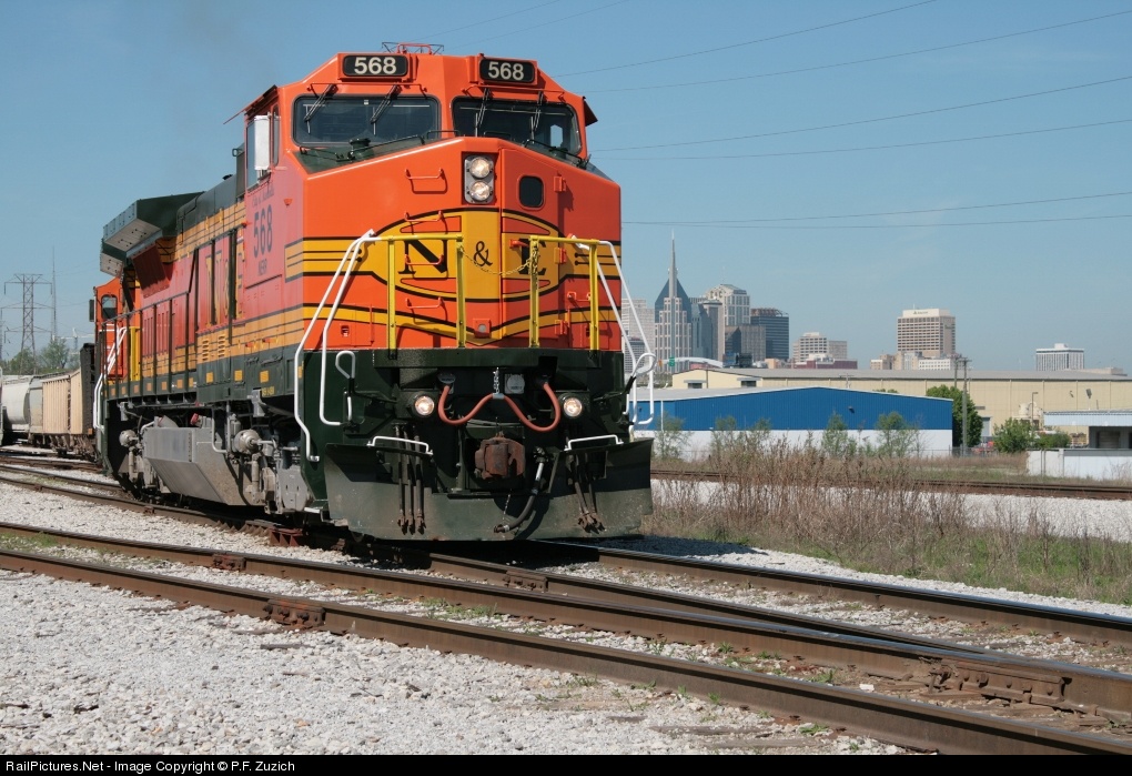 Ex BNSF 568 now works for the Nashville and Eastern with a slightly modified paint scheme. Here it is seen with its namesake city's skyline in the background.(Nashville)