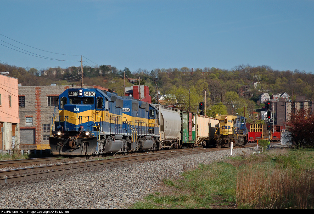 ICE's 6400, "City of Sanborn" and 6458 "City of Montpelier" lead Q275 west out of Cumberland for a climb up Sand Patch. Waiting for the Q to clear is the Sand Patch helper, not needed on Q275 today. The 7742 will return to the caller's office in the east yard at Cumberland and await further duty, as soon as it gets the clear.