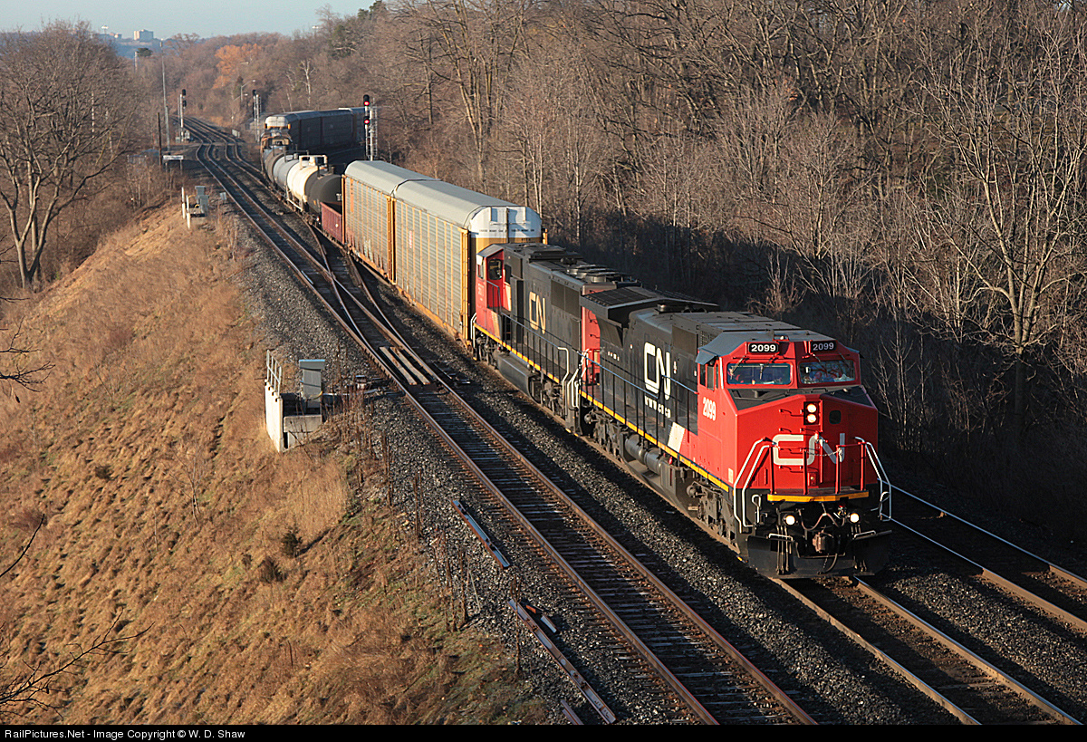 | An early morning freight (CN 370 running 8 hours late - info thanks to Brendan Frisina) coming off the Dundas Sub and onto the Oakville Sub at Bayview Junction crosses over the municipal boundary between Hamilton and Burlington. The actual border line lies approximately where the third tanker in the consist is. 2099 is ex BNSF nee ATSF 866. |