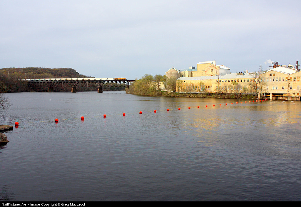 The rear DPU on a loaded unit sand train waits to head west by the Cascade Tissue Paper Plant in Eau Claire.