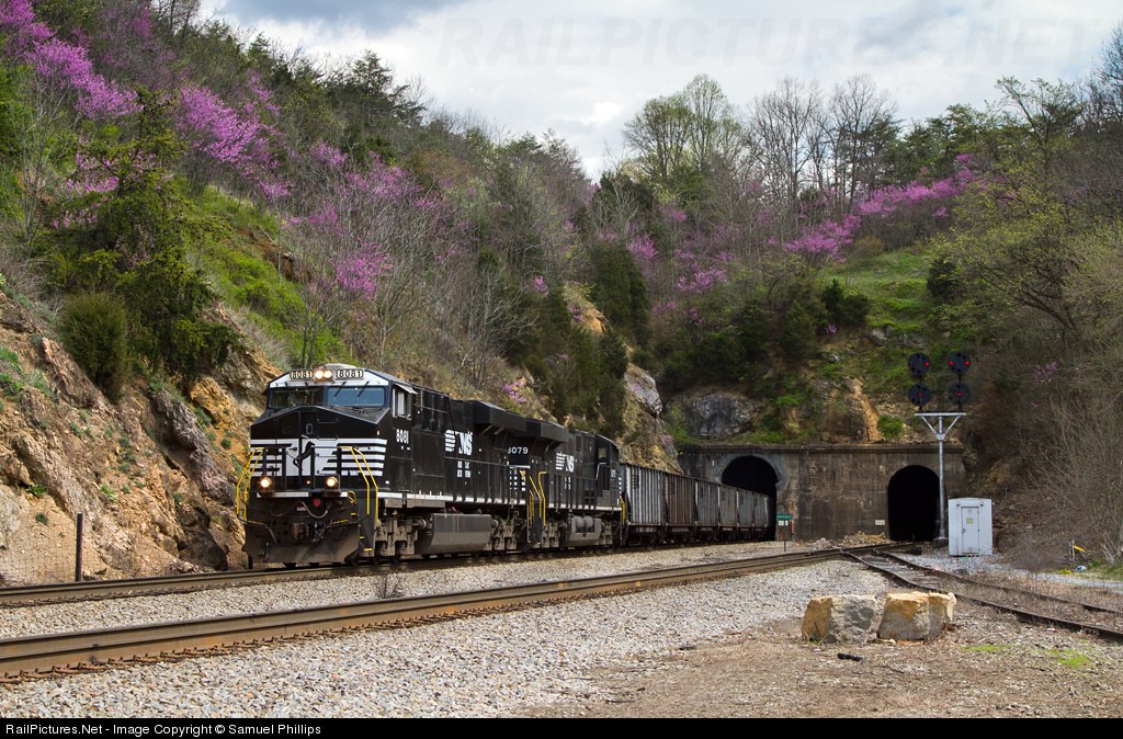 Spring has sprung on Christiansburg Mountain! With red buds in full bloom, NS 825 drags out of Montgomery Tunnel on a beautiful Spring afternoon.