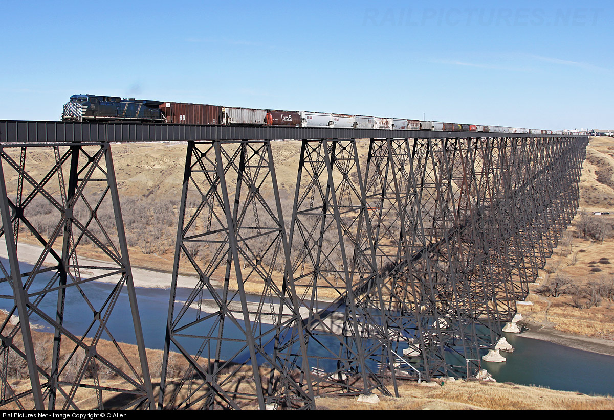 | Two bluebirds (CEFX 1028 at the head end and CEFX 1047 mid train) power this grain train across the mile long High Level Bridge, 314 feet above the Oldman River, in Lethbridge, Alberta. The 102 year old trestle is the largest of its kind in the world. |