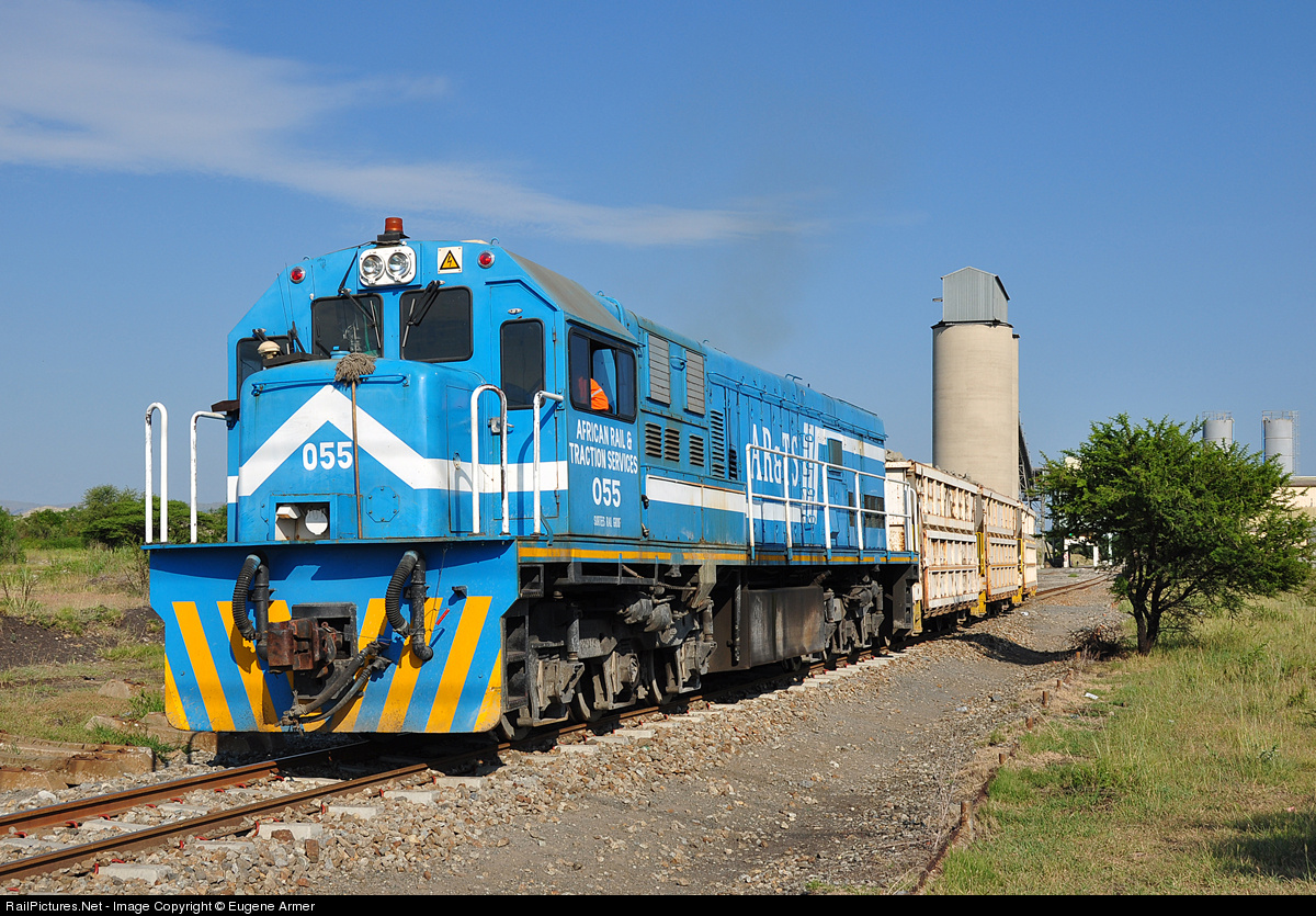 | African Rail & Traction Services (AR&TS) have a number of locomotives on hire to Anglo Platinum for their Rustenburg system. Here no.055, an ex-Mozambique Railways (CFM) U20C built by GE (Brazil), is easing its train of loaded hoppers away from Frank Shaft. The mop tucked into the handrail on the front of the loco seems to be a favourite with some of the crews here. |