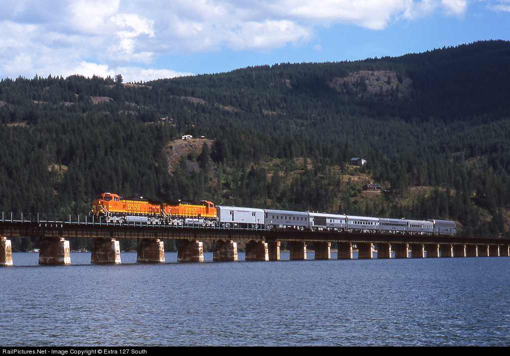 An eastbound BNSF "Directors Special" was crossing Lake Pend Oreille at Sandpoint, ID on Aug. 10, 2002.