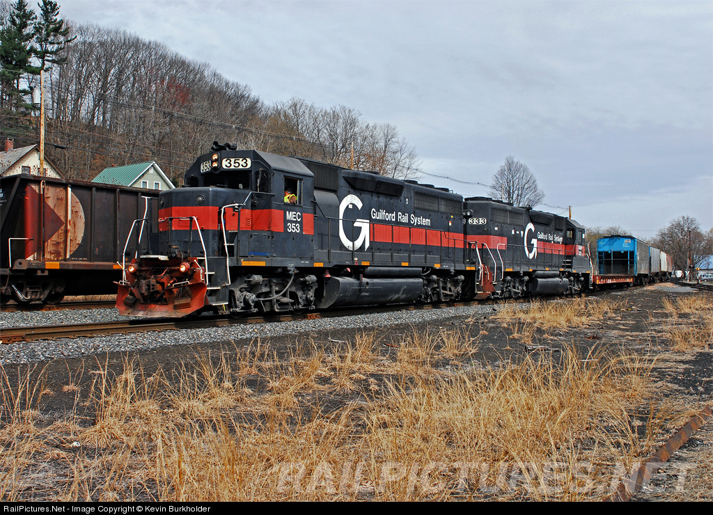 | Pan Am Railways has been making it back to White River Junction during the past few weeks with what is said to be with sustained regularity. This day, the White River Junction to East Deerfield, MA train WJED is seen with matched Guilford Rail System-painted GP40s - MEC 353 and B&M 333, along with 5 empty cars. The ex-CP coal gons the train is rolling by are part of the 9-car loaded scrap metal cut that was dropped by the northbound EDWJ for Quebec. Be sure to check out more photos at http://steelwheelsphotography.com |