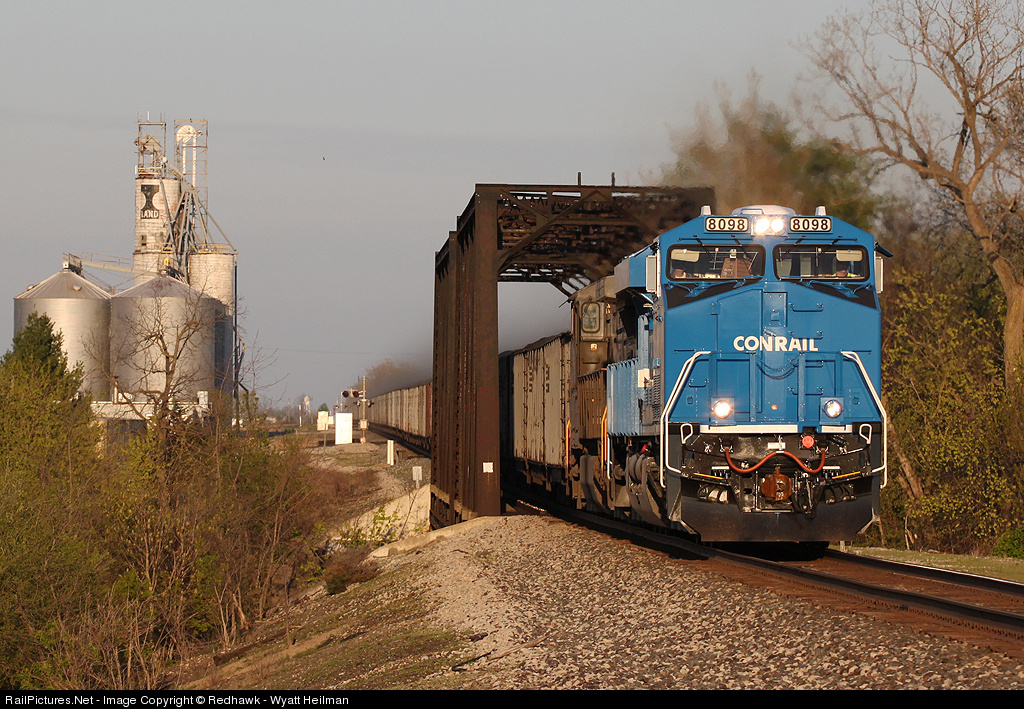 | The Conrail heritage unit leads westbound coal train 866 across the Auglaize River in Oakwood as coal dust blows from the consist, leaving the small town in a thick black cloud. Big blue lives on! |