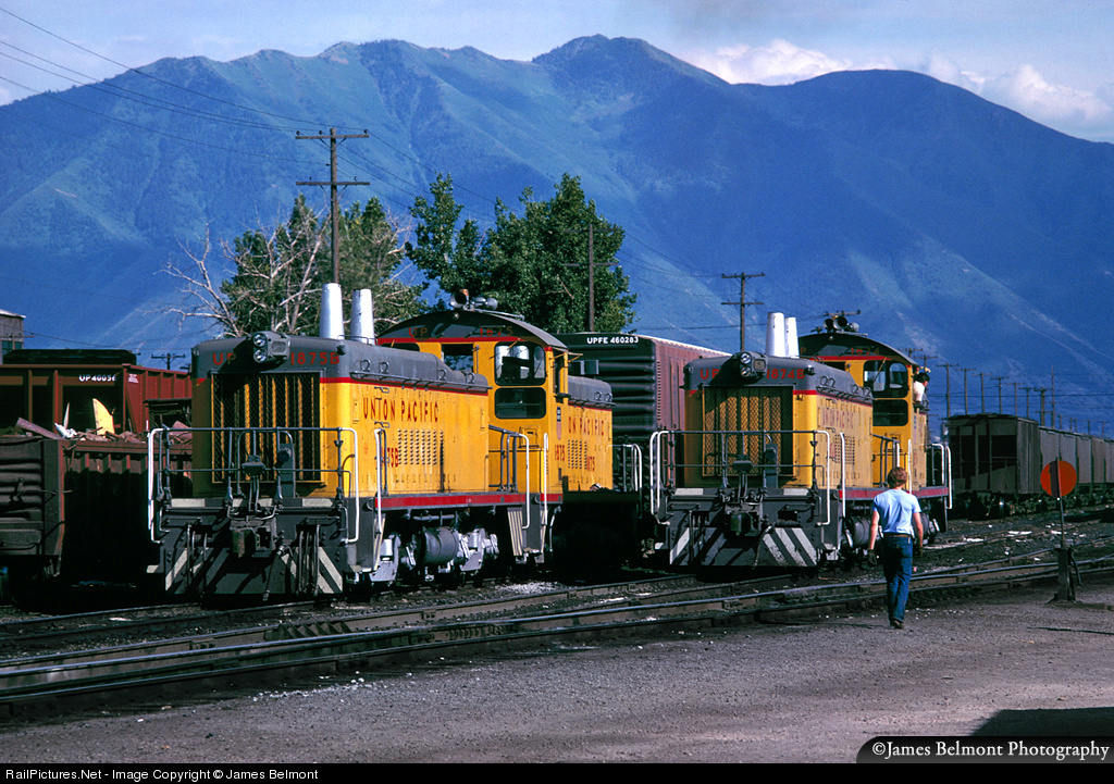 Welcome to the stockyard! A pair of EMD TR5 (Transfer) 'cow and calf' switchers work the north end of UP's Provo Yard. Pairs of EMD TR5s, built in 1951, were assigned to work at Provo during much of the 60s, 70s, and early 80s to drag heavy ore and coal trains to Geneva Works and coil steel and pipe trains back to Provo. Overall, the TR5s were a rare breed, with EMD producing only 10 of the cabbed A units and 12 of the B's. The A and B units produced 1200 HP each and were connected via a draw bar making them semi permanent sets. UP 1875 & 1874 were set up for multiple unit operation, making for occasional doubleheaded runs to Geneva and return when tonnage levels were extra high.
