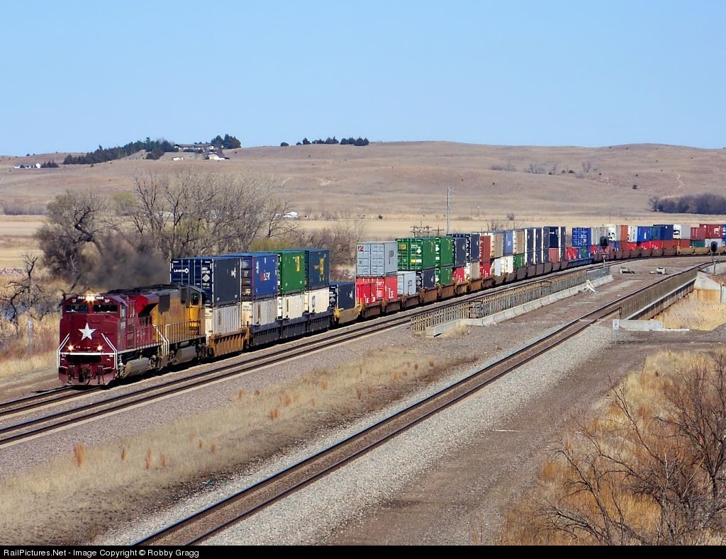 The Katy heritage units leads a Oakland bound stack train into North Platte. The 1988 had some electrical issues and would not continue past Bailey Yard.