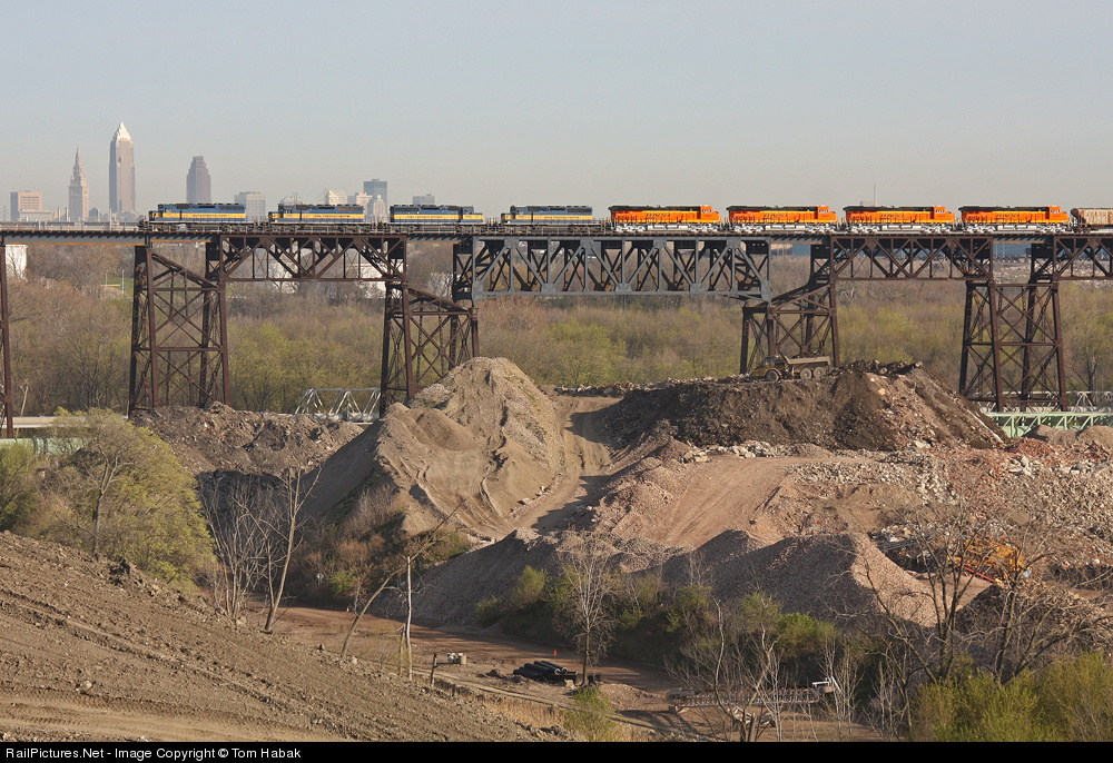 | Q393-02 crosses the Cuyahoga Valley with a DME/ICE/ICE/ICE lash-up for power. In tow are new deliveries BNSF 6962,6963,6948, and 6965 |