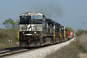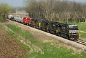 Three NS units lead a NS test grain train on Iowa Interstate tracks at MP277. Behind the NS engines are two Iowa Interstate engines followed by two "in transit" Nebraska Central SD40's fresh out of NRE in Silvis.