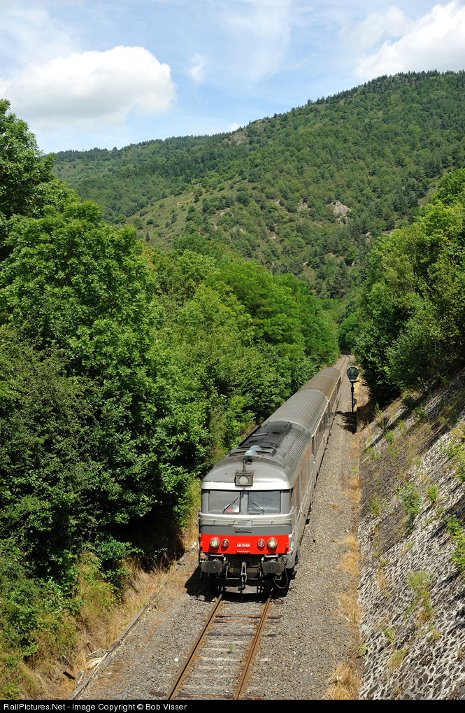 | One of the three remaining trains on the scenic Cevennenline (Clermont-Ferrand - Nimes) and this is the only one that is locohauled. Due to the poor condition of the track speed limit has been reduced to 25 km/h. |