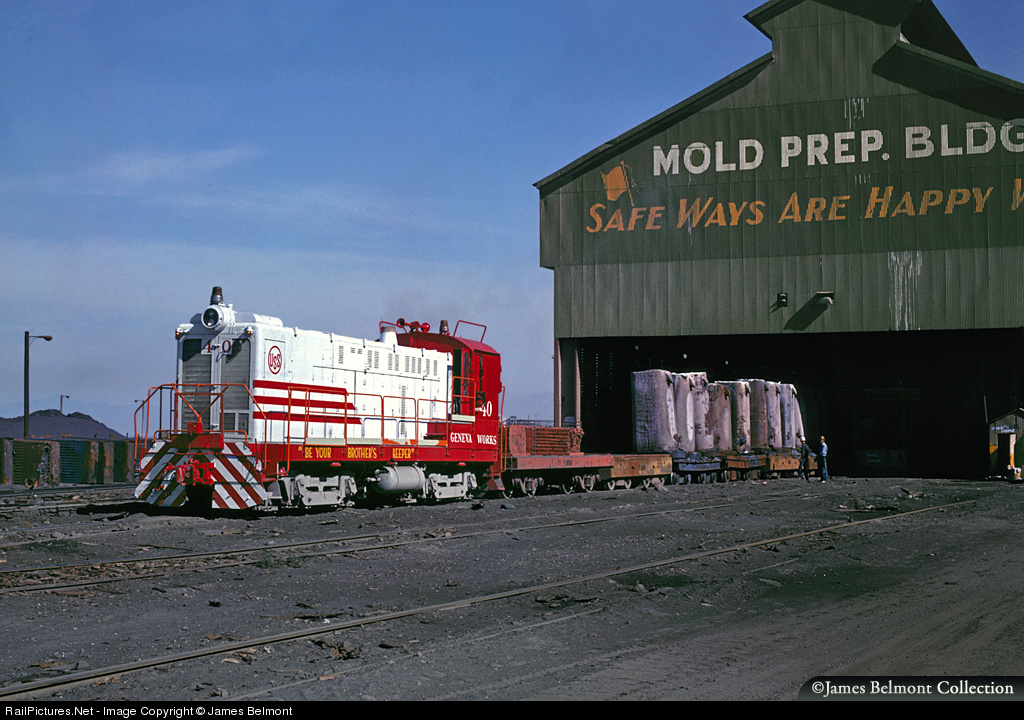 | "Be Your Brother's Keeper" . . . One of my all-time favorite photos at Geneva Works features United States Steel 40 working the south end of the Mold Preparation Building in Vineyard. Note the stark contrast between the freshly painted Baldwin S-12 and the industrial fallout of the mill property. USS 40 (blt. the Southern Pacific 1499 in Nov. 1950) was acquired from Chrome Crankshaft in July 1973. No doubt the shiny bright livery on #40 didn't last long within the harsh environs of the mill. "Safe Ways are Happy Ways." |
