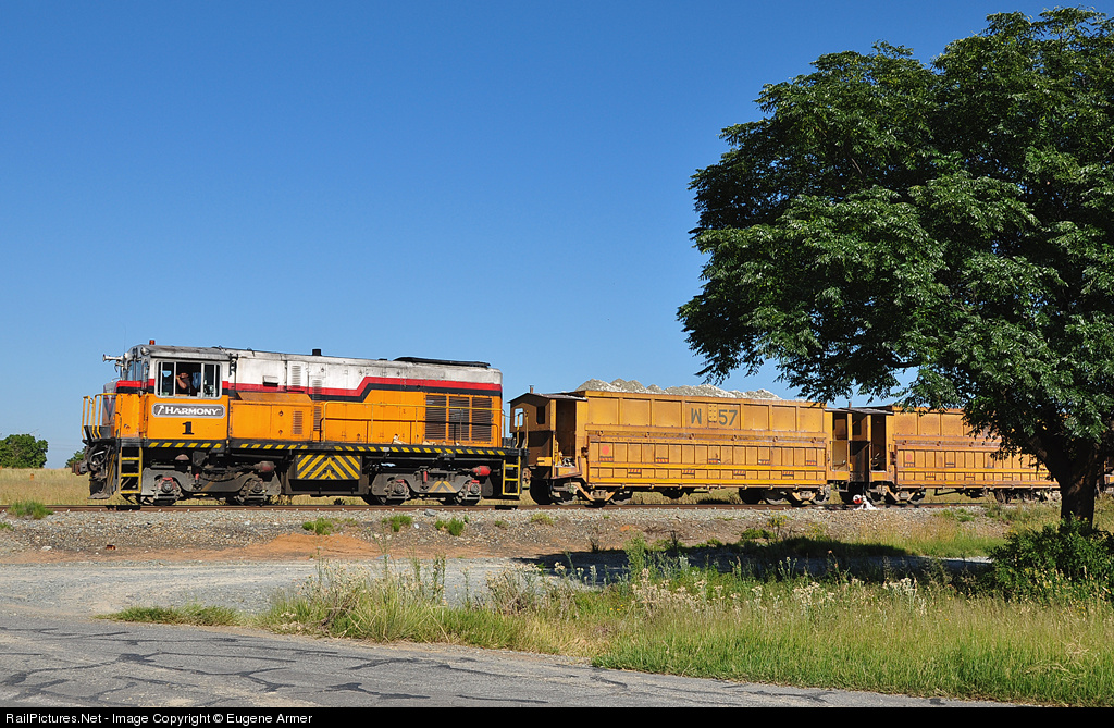 | Harmony Gold's # 1 hauls a train load of reef from Brand siding towards Harmony One Plant for processing. Brand siding is the exchange point, where RRL Grindrod locomotives hand over their loaded trains to Harmony Gold and return the empties to Nyala or Tshepong mines. |