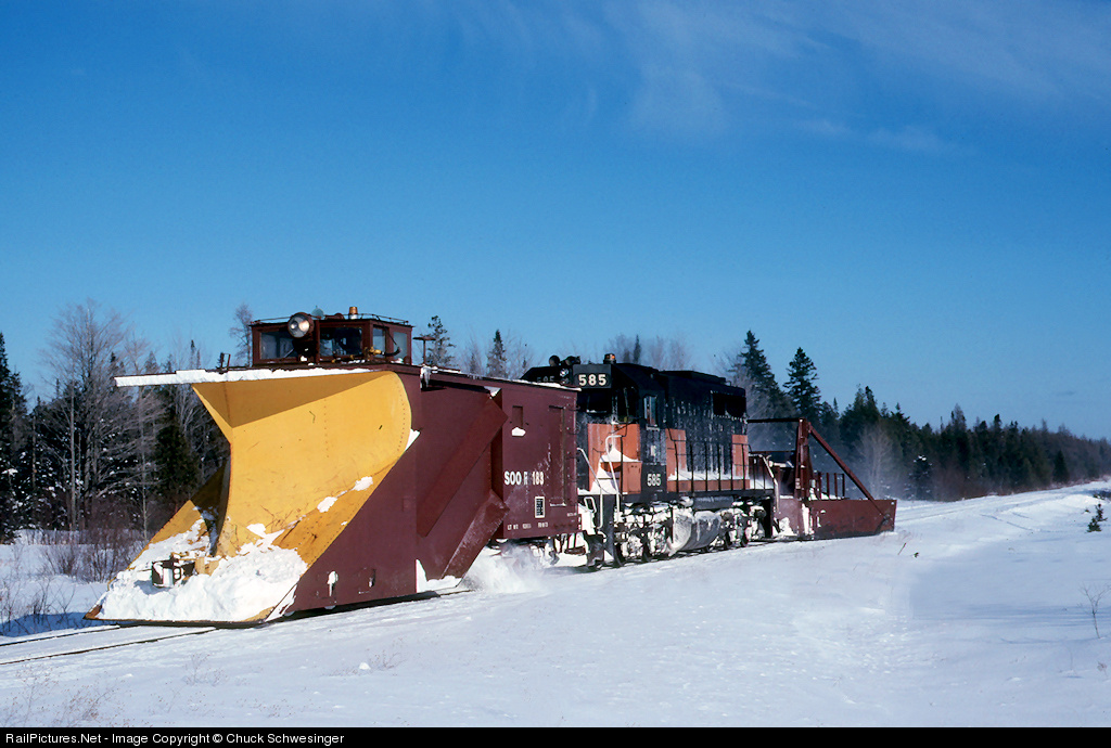 | WC was working through its first winter in Jan. of 88 and operations were a bit of a struggle. SDL 585 still in the infamous Soo "bandit" scheme works west at Caffey pushing the Russell plow that Soo had assigned to Gladstone for many years. The plow still wears its Soo R-183 number even though it had came along in the sale of equipment and property to the WC the prior October. |