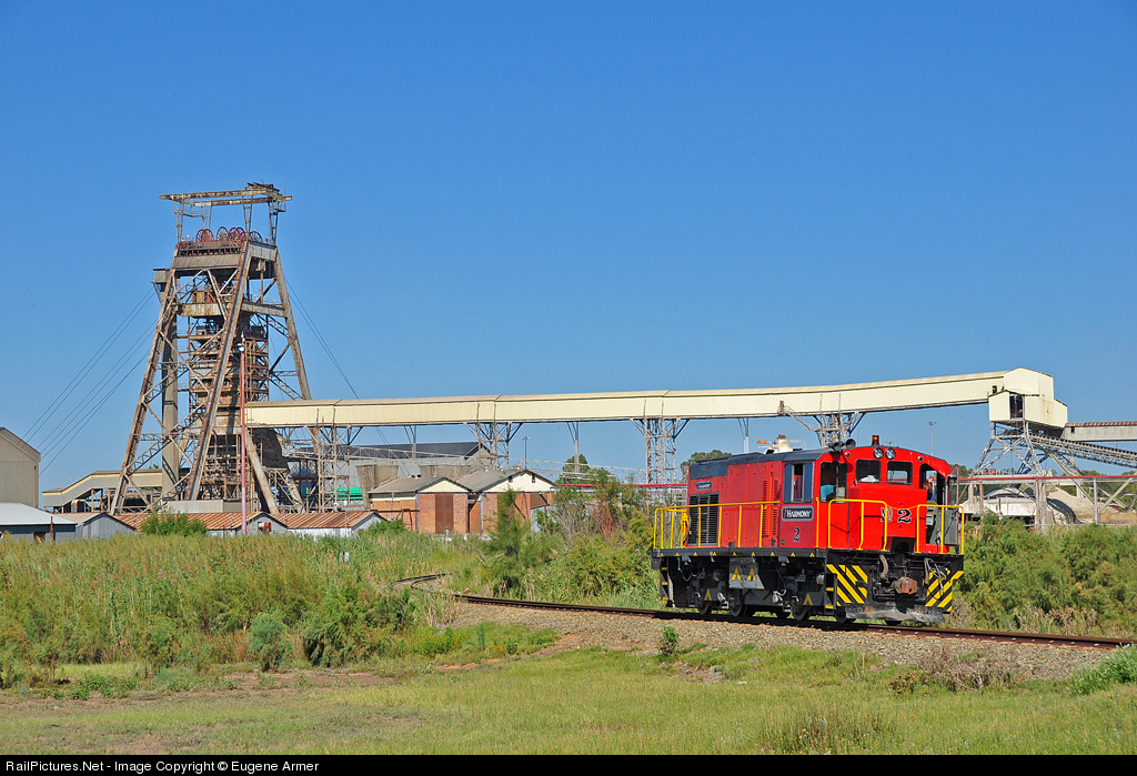 | Resplendent in its new red and orange livery, recommissioned Harmony Gold #2 (renumbered from # 8) is heading away from the photographer towards Harmony's Bambanani mine, where it will reverse direction to collect a loaded train from the Sheltam exchange siding. |