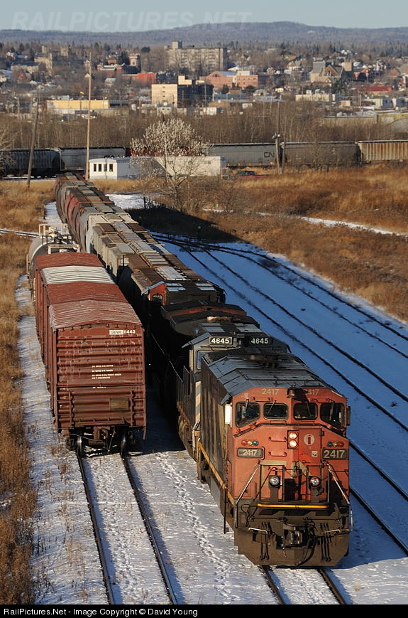 | An extra yard uses three big road units including BCOL 4645 to shove 15 cars back into the small P&H elevator (out of the frame, to the right). By month's end the shipping season will end and the port will close for the winter and most of these rails will rust over, awaiting for the spring time rush when grain destined for export markets flow into the port via CP and CN! |