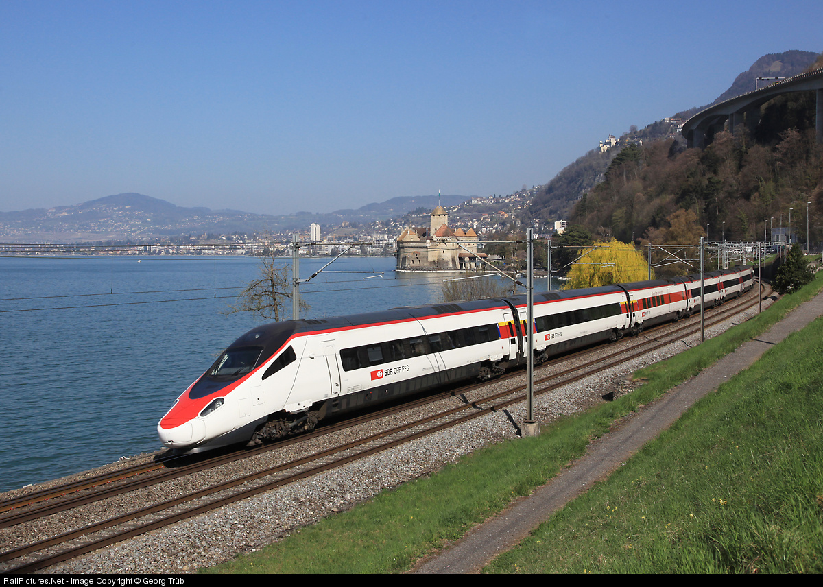 | High speed tilt train ETR 610 009 as Eurocity 32 Milan - Geneva Airport just reached the shore of Lake Geneva and will soon pass Chillon castle. |