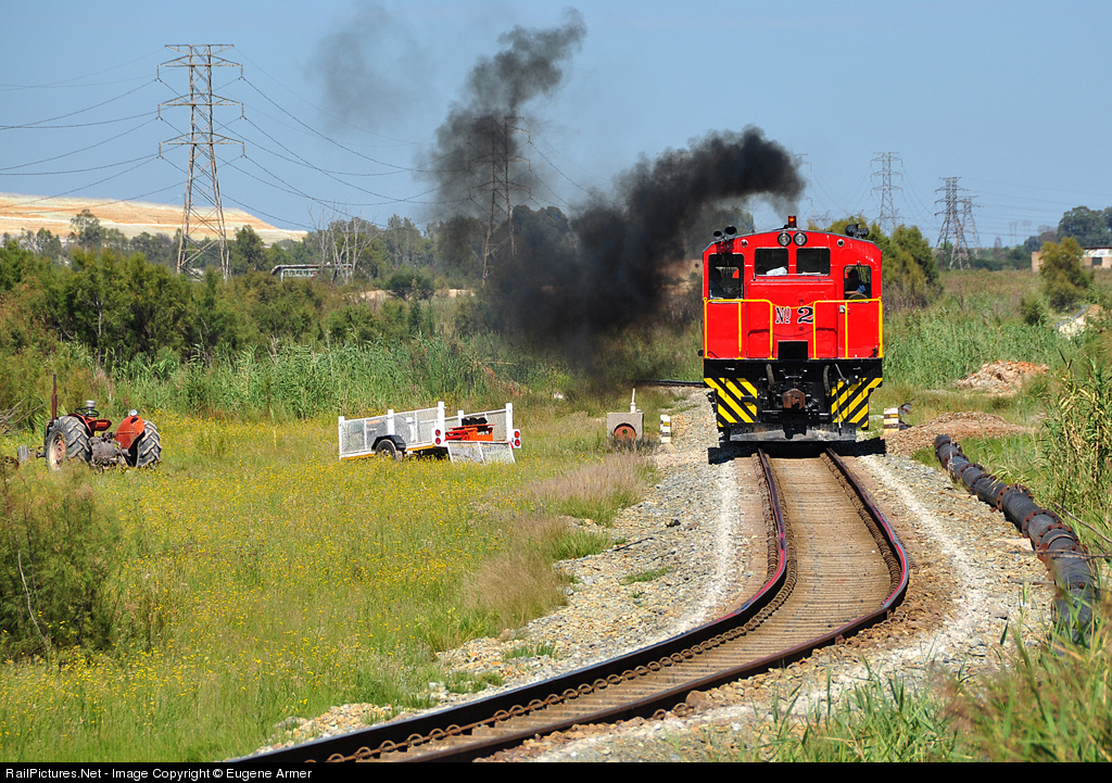 | The recommissioning of Harmony Gold #2 (renumbered from #8) included a repaint in an eyecatching bright red livery. Here #2 smokes it up while hauling empties from Harmony One Plant to the exchange siding at Bambanani, where a Sheltam loco will take over for the run to Masimong mine. The tractor and trailer belong to a pipe laying crew, who decided to take a break from their work. |