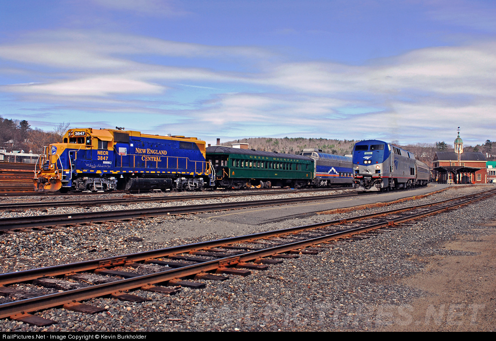 | New England Central Railroad GP38 3847 sits idle with the passenger extra that had been used in Montpelier, VT on April 4 for Rail Day at the State House functions and includes Green Mountain Railroad equipment and the SLRG full-length dome 508, as Amtrak's southbound Vermonter train #57 rolls by on the main and past the White River Junction depot. Be sure to check out more photos at http://steelwheelsphotography.com |