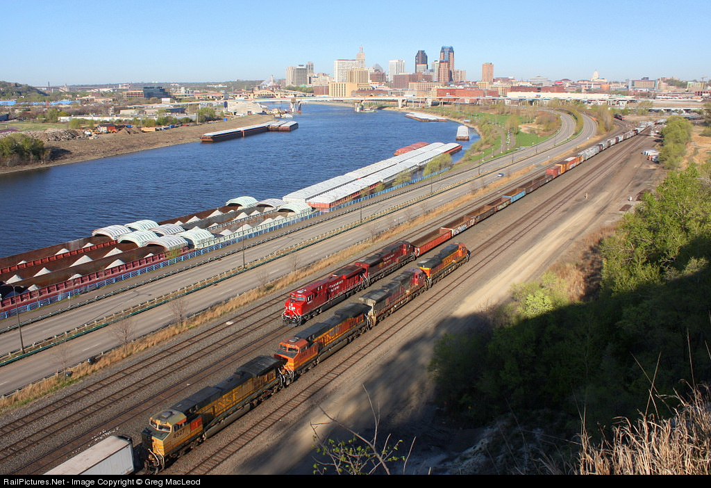 CP and BNSF trains meet at Dayton's Bluff while a loaded coke train led by two SOO SD60s waits for things to clear. Amtrak's Empire Builder is also barely visible waiting behind the coke train.